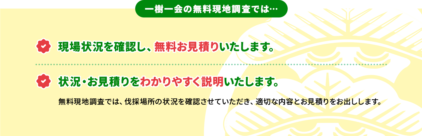 現地に伐採のプロが伺います!細かな状況確認後、ご説明とお見積りのご提示をいたします。